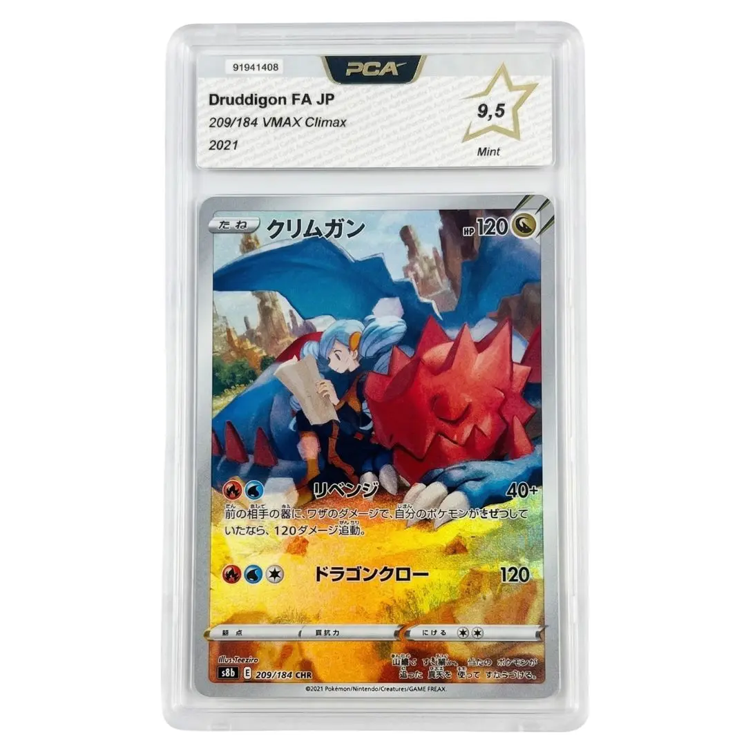 Bienvenue sur Pokelite. Nous vous présentons ce magnifique Drakkarmin 209/184. Issue de l’extension originale japonaise VMAX Climax. Certifiée par PCA avec la note de 9,5.