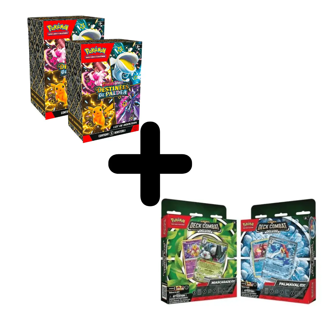 - Deux Bundles Destinées de Paldea : Chaque bundle contient six boosters de la série Destinées de Paldea, augmentant vos chances de découvrir des cartes rares et puissantes. Ces boosters sont essentiels pour ceux qui cherchent à ajouter de la diversité et de la profondeur à leur collection.