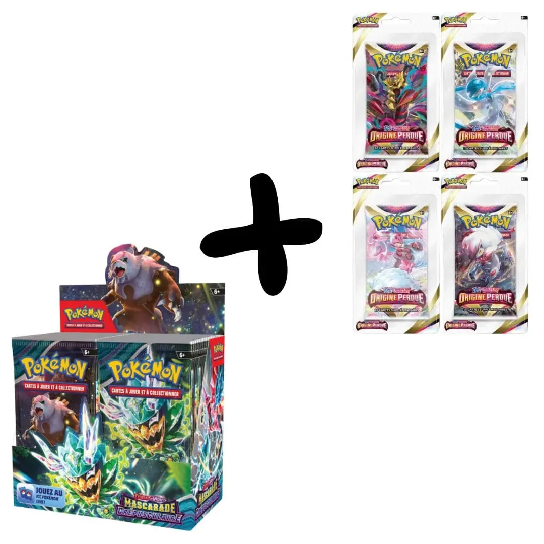 Enrichissez votre collection avec notre Pack EV06, une combinaison exclusive qui vous offre le meilleur des deux mondes : une Display complète de l’extension EV06 Mascarade Crépusculaire et un artset Origine Perdue. Ce pack est conçu pour les collectionneurs et joueurs du JCC Pokémon qui cherchent à diversifier leur deck avec des cartes puissantes et rares.